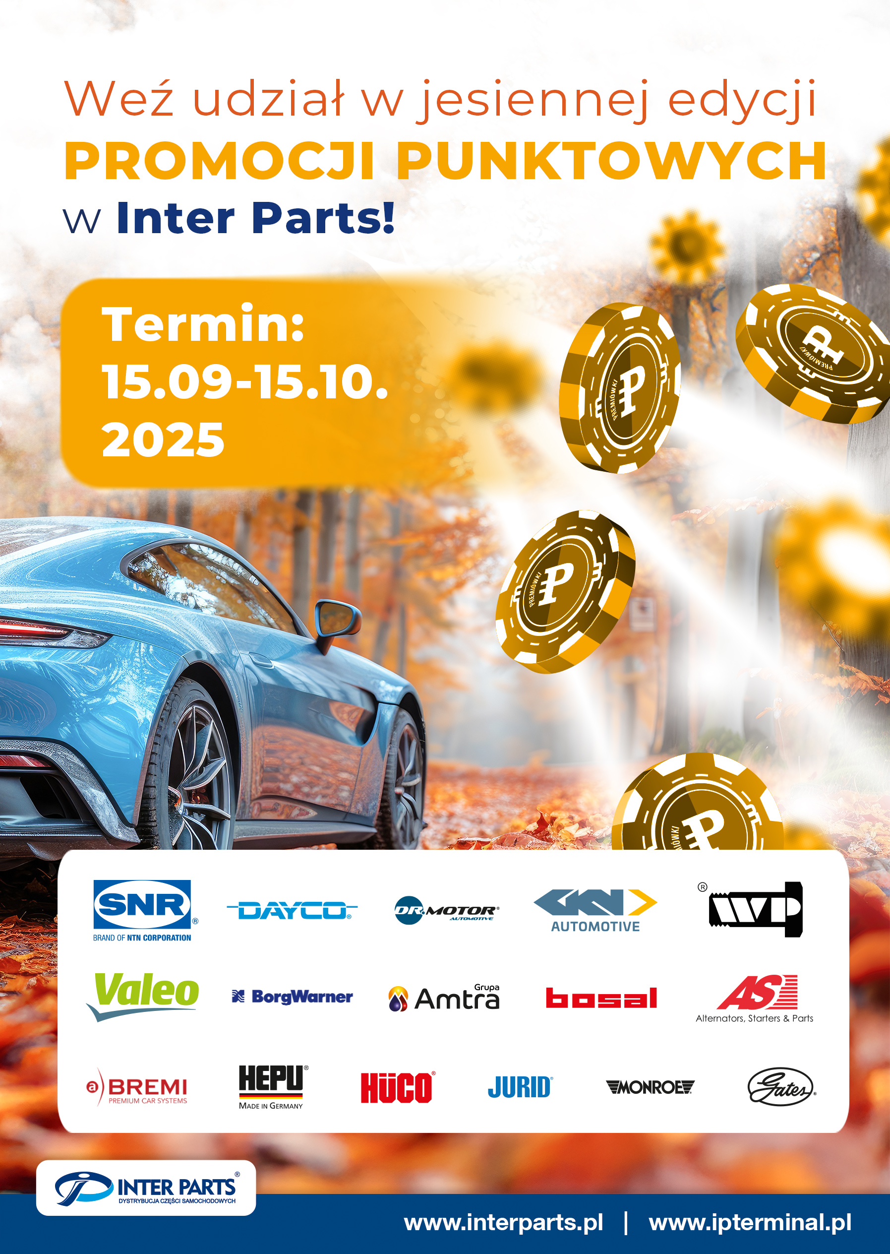 Od 15.09 - 15.10.2025 r. przy zakupach produktów wybranych dostawców o wartości powyżej 50 zł na jednym dokumencie sprzedaży otrzymasz dodatkowe Premiówki do wykorzystania w programie punktowym Inter Parts.